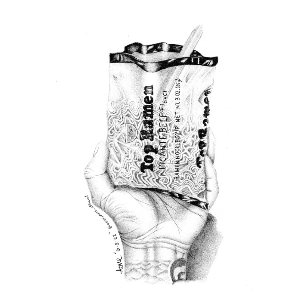 “When somebody looks at my artwork, I want people to see how we eat Ramen soups while in the hole and feel the struggle. Abolition, Resistance, Transformation to me means change, and inspiration to uplift, along with fighting for something positive.”