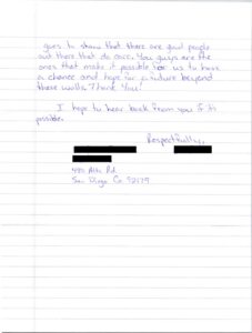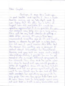 Greetings, I hope this finds you in good health and spirits. I have a Parole Hearing coming up in late April and I was hoping that the offer for a letter of support was still available. It would be greatly appreciated if it is possible. As you can imagine any help can go a long way. This will be my first chance at getting a date after serving 24 years. I’ve been incarcerated since the age of 17 and finally having a chance to get out is a big deal. I’m not sure if you’ll receive this letter but the reason I’m writing you is because I asked about information for Transitional Housing and you sent me some really helpful information. Making it possible for me to get accepted into a couple different programs if I’m released. You also said to write when I’m close to board and you would provide a letter of support. I know it’ll be from Initiate Justice and not one person specifically. I do want to say thank you to you and all the staff members for everything you guys do to help people like me. You guys take time out of your busy lives to help people you’ve never met and that in itself is very honorable and goes to show that there are good people out there that do care. You guys are the ones that make it possible for us to have a chance and hope for a future beyond these walls. Thank You!